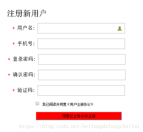 <!DOCTYPE html> <html lang="en"> <head> <meta charset="UTF-8"> <title>Title</title> <style> .p{ color:red; margin-left:20px; display:inline-block; } .c{ color:red; margin-left:4px; display:inline-block; } .l{ font-size:18px; } .d{ height:35px; width:300px; display:inline; } .i{ height:30px; width:300px; } </style> </head> <body> <div style="height:80px;"></div> <form enctype="multipart/form-data"> <div style="width:500px;float:left;margin:0 20px;"> <div style="font-size:28px;">注册新用户</div> <br/> <span class="p">*</span> <label for="username" class="l">用户名:</label> <div style="height:35px;width:300px;position:relative;display:inline;"> <input id="username" type="text" style="height:30px;width:250px;padding-right:50px;"> <span style="position:absolute;right:18px;top:2px;background-image:url(user.ico);height:16px;width:16px;display:inline-block;" ></span> </div> <br/><br/> <span class="p">*</span> <label for="phonenumber" class="l">手机号:</label> <div class="d"> <input id="phonenumber" type="text" class="i"> </div> <br/><br/> <span class="c">*</span> <label for="login_password" class="l">登录密码:</label> <div class="d"> <input id="login_password" type="text" class="i"> </div> <br/><br/> <span class="c">*</span> <label for="confirm_password" class="l">确认密码:</label> <div class="d"> <input id="confirm_password" type="text" class="i"> </div> <br/><br/> <span class="p">*</span> <label for="ver_code" class="l">验证码:</label> <div class="d"> <input id="ver_code" type="text" class="i"> </div> <br/><br/> <input type="checkbox" name="agree" style="margin-left:100px;display:inline-block;" value="1"/> <span style="font-size:10px;">我已阅读并同意《用户注册协议》</span> <br/><br/> <input type="submit" value="同意以上协议并注册" style="margin-left:100px;height:30px;width:300px;background-color:red;display:inline-block;"/> </div> </form> </body> </html>