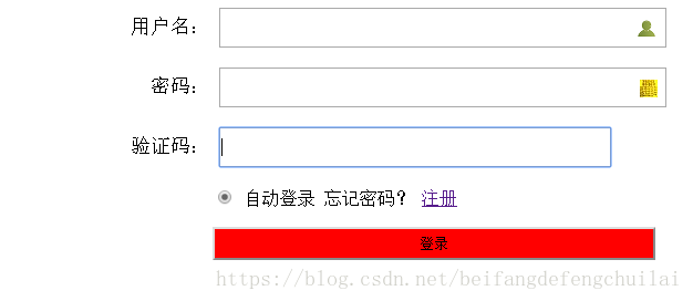 <!DOCTYPE html> <html lang="en"> <head> <meta charset="UTF-8"> <title>Title</title> </head> <body> <div style="width:500px;float: right;margin:0 auto;" > <label for="username" style="font-size:18px" >用户名:</label> <div style="height:35px;width:400px;position:relative;display:inline" > <!--相关位置--> <!--此处为相关位置与绝对位置联合使用--> <input id="username" type="text" style="height:30px;width:350px;padding-right:50px;"> <span style="position:absolute;right:18px;top:2px;background-image:url(user.ico);height:16px;width:16px;display:inline-block;"></span> <!--绝对位置--> </div> <br/> <br/> <label for="password1" style="font-size:18px" > 密码:</label> <div style="height:35px;width:400px;position:relative;display:inline" > <!--相关位置--> <!--此处为相关位置与绝对位置联合使用--> <input id="password1" type="text" style="height:30px;width:350px;padding-right:50px;"> <span style="position:absolute;right:16px;top:2px;background-image:url(p.ico);height:16px;width:16px;display:inline-block;"></span> <!--绝对位置--> </div> <br/> <br/> <label for="verification_code" style="font-size:18px" >验证码:</label> <input id="verification_code" type="text" style="height:30px;width:350px;"> <br/> <br/> <div style="width:426px;float: right;"> <input type="radio" name="auto_login" value="1"/> 自动登录 <a herf="找回密码网址">忘记密码?</a> <a href="http://localhost:63342/jichu/day16/注册.html?_ijt=eb8klk8d781ojsf5e8eb7tjf41">注册</a> </div> <br/> <br/> <div style="width:426px;float: right;"> <input type="submit" value="登录" style="height:30px;width:400px;background-color:red;"/> </div> </div> </body> </html>