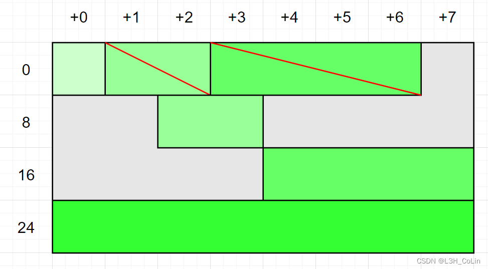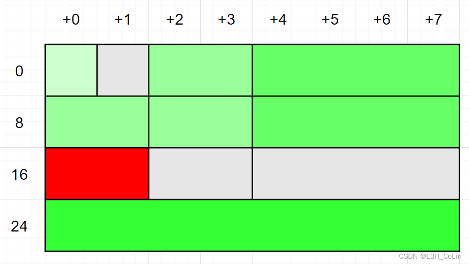 如上图所示,每一个小的正方形都表示一页,用红线划去的是不允许出现在伙伴系统中的块。上面的两个不允许出现的块都是因为其起始地址不能被自身大小所整除。