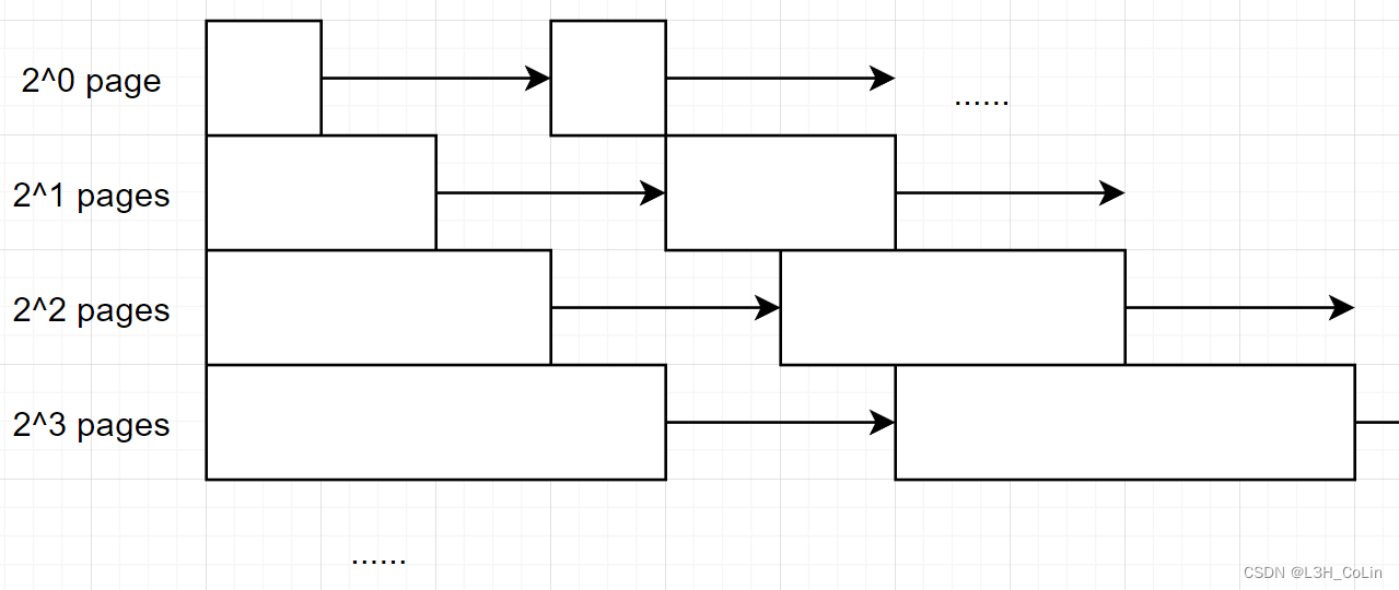 伙伴系统用于管理以页为最小单位的内存空间,能够在一定程度上减少内存空间中的碎片。其维护需要一组链表,每一个链表中保存大小相同的连续内存块,这些内存块的大小为一页的2次幂。且所有内存块的起始地址必须是内存块自身大小的整数倍。