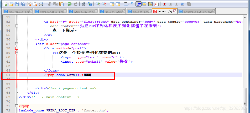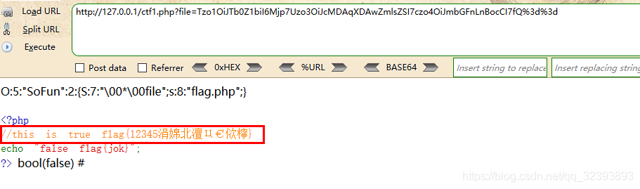 将序列化之后的字符串在网页中进行提交,要先进行base64编码和url编码:Tzo1OiJTb0Z1biI6Mjp7Uzo3OiJcMDAqXDAwZmlsZSI7czo4OiJmbGFnLnBocCI7fQ%3d%3d