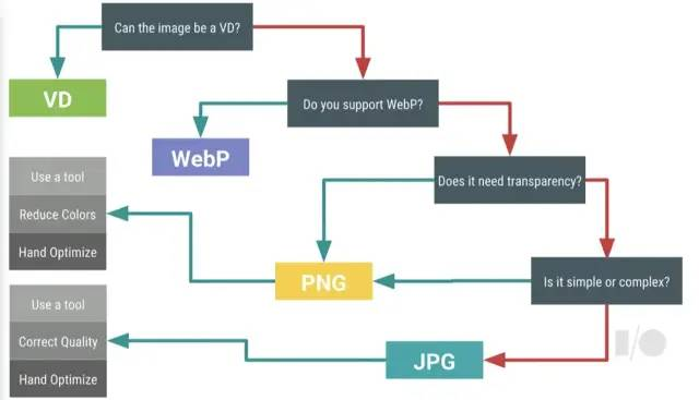 在 Google I/O 2016 中,讲到了如何选择相应的图片格式。首先,如果能用 VectorDrawable 来表示的话,则优先使用 VectorDrawable;否则,看是否支持 WebP,支持则优先用 WebP;如果也不能使用 WebP,则优先使用 PNG,而 PNG 主要用在展示透明或者简单的图片,对于其它场景可以使用 JPG 格式。简单来说可以归结为如下套路: