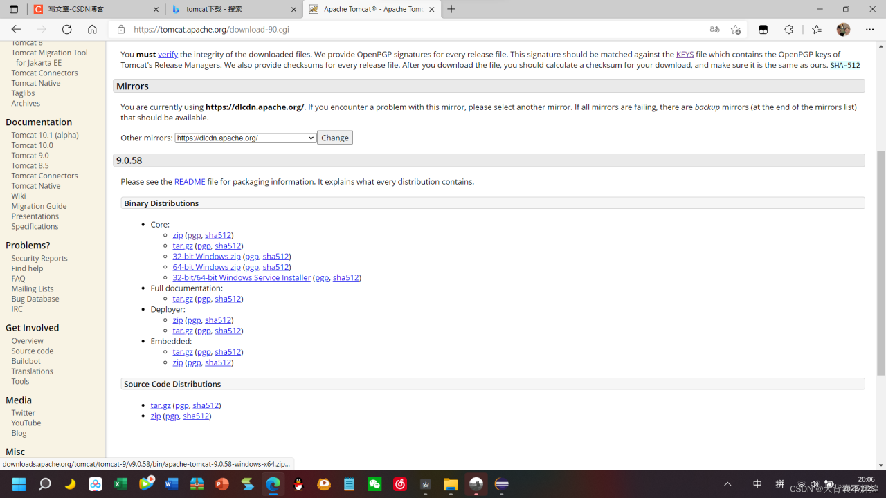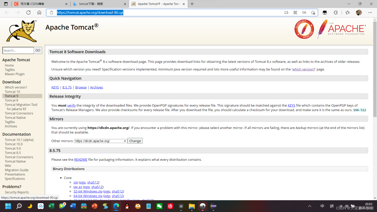 1、进入官网https://tomcat.apache.org/download-80.cgi,找到左侧中的Download找到对应版本的tomcat(我下载的是tomcat9)。