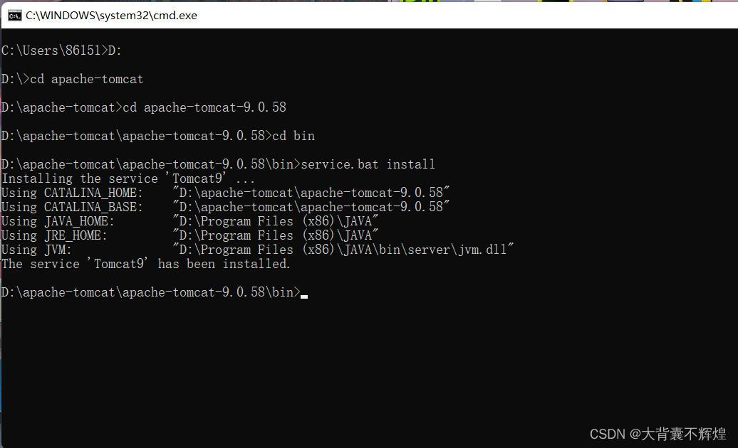 2.通过Windows服务安装Tomcat,打开命令提示符,运行service.bat批处理脚本service.bat install,详细操作如下所示。(出现has been installed即代表安装成功)