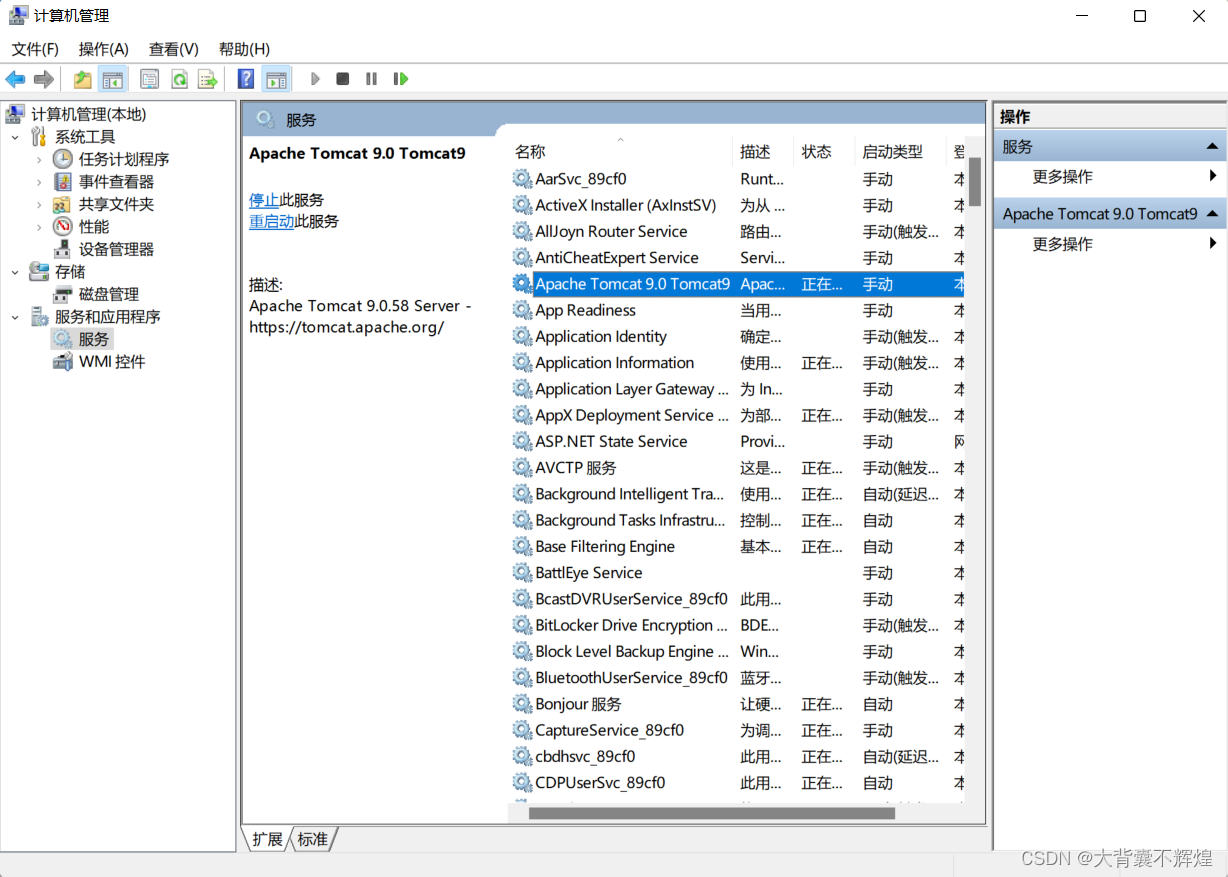 右键点击桌面上的“此电脑”->“管理”->“服务和应用程序”->“服务”,找到“Apache Tomcat 9.0 Tomcat9”服务,右键点击该服务,选择“启动”。