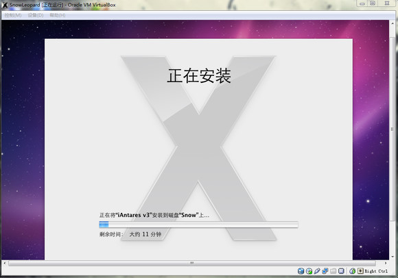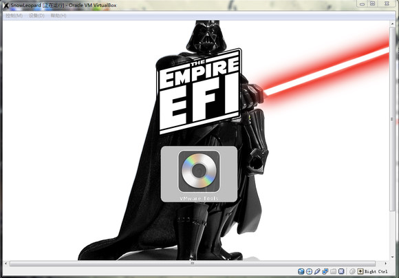 关闭虚拟机,(说明:需要关闭Mac OS X Lion系统时可关机,或直接强制关闭虚拟机,每次都需要利用引导工具开机)在设置——storage中将引导文件重新加载,启动虚拟机,多了一个苹果图标,那个就是安装好的Snow Leopard啦: