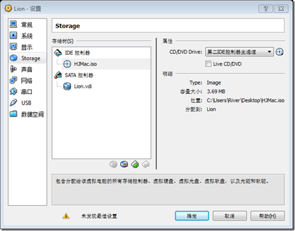 进入Storage选项,点击CD/DVD Drive右边再右边的那个光盘状图标,选择系统安装引导光盘empireEFIv1085.iso(不是图中这个)(改版Mac OS X lion 系统可直接设置为Mac OS X Lion.iso镜像文件):