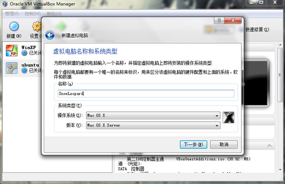 运行VirtualBox——新建——下一步——操作系统选择Mac OS X,版本选择Mac OS X Server(32/64bit):