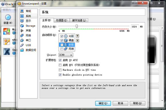 现在返回到了VirtualBox的主界面,选中刚才新建的“Snow Leopard”虚拟电脑,点击“设置”打开其配置窗口。要使“雪豹”能正常安装我们还需要做点调整。点击左侧的“系统”选项,然后在右侧分别点击主板、处理器和硬件加速,并这样进行设置:把软驱前面的勾去掉,启用IP APIC,禁用EFI(只针对某些操作系统),Enable Absolute pointing device,启用PAE/NX,启用VT-x/AMD-V,启用Nested Paging,显存拉到128MB,2D和3D加速都勾起来。(2D貌似不可用)——关键点:照图设置:,上面很关键有些机器必须禁用EFI,否则启动不了。
