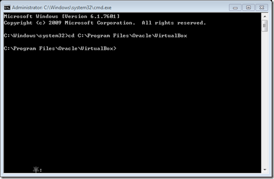 使用cd 命令跳至VirtualBox的安装位置。例如我的VirtualBox安装在C:\Program Files\Oracle\VirtualBox,故输入cd C:\Program Files\Oracle\VirtualBox,回车即进入:
