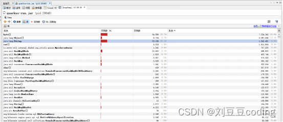 首先,通过JVisualVM观测了实验3进程20048的运行情况,进行了1次堆dump,如图 7,将实例数按占用大小进行排序,对应前三的类名分别为:byte[]、java.lang.Object[]、java.lang.Stirng。