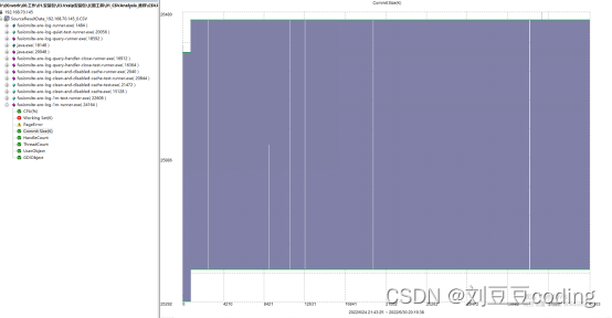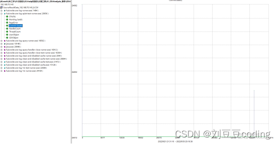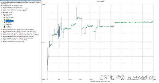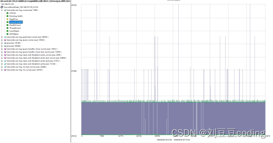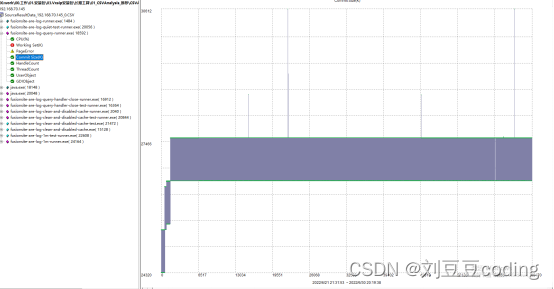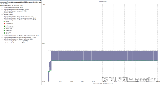 持续观测8天,见图 3,内存提交大小曲线涨幅为11MB。内存提交大小曲线不规律,存在阶跃响应,某些时刻涨幅较大,而回落很小。可得出结论,以jar包方式部署服务,查询接口涉及到的代码,可能存在内存泄漏。