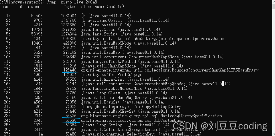 由于java服务可以使用JvisualVm和jmap相关工具的优势,我们对堆栈信息进一步追踪,通过jvisualvm中的jmap -histo:live 20048 命令,多次截取堆内存占用情况,可以观察到Hibernate相关实例占用堆空间,平均为0.1M。某次的截取如图 4所示: