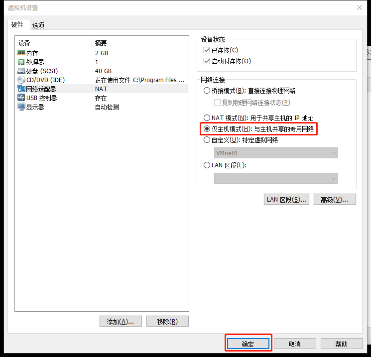 2、分别将五台虚拟机的网络模式改为仅主机模式(五台操作相同)