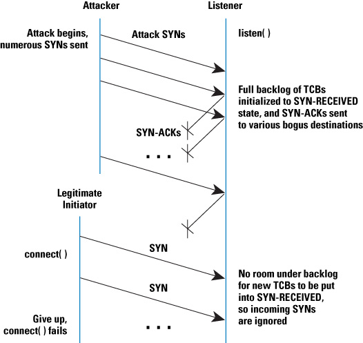 这就导致了一个明显潜在的DoS攻击,到达的SYN包将被分配过多的TCB而导致主机的内核内存被耗尽。为了避免这种内存耗尽,操作系统通常给监听接口关联了一个"backlog"队列参数,它同时维护连接的TCB上限数量和SYN-RECEIVED状态。尽管这种方案使主机的可用内存免遭攻击,但是backlog队列本身就带来了一个(小的)受攻击源。当backlog中没有空间时,就不可能再响应新的连接请求,除非TCB能被回收或者从SYN-RECIEVE状态中移除。