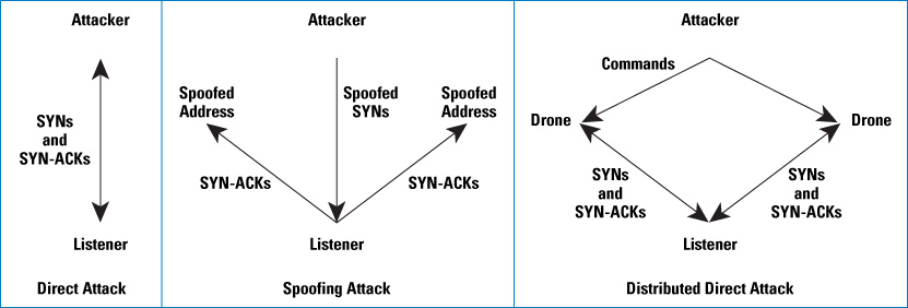 如果攻击者用他们自己的没有经过伪装的IP地址快速地发送SYN数据包,这就是所谓的直接攻击。这种攻击非常容易实现,因为它并不涉及攻击者操作系统用户层以下的欺骗或修改数据包。例如,他可以简单地发送很多的TCP连接请求来实现这种攻击。然而,这种攻击要想奏效攻击者还必须阻止他的系统响应SYN-ACK包,因为任何ACK、RST或ICMP(Internet Control Message Protocol)包都将让服务器跳过SYN-RECEIVED状态(进入下一个状态)而移除TCB(因为连接已经建立成功或被回收了)。攻击者可以通过设置防火墙规则来实现,让防火墙阻止一切要到达服务器的数据包(SYN除外),或者让防火墙阻止一切进来的包来使SYN-ACK包在到达本地TCP处理程序之前就被丢弃了。