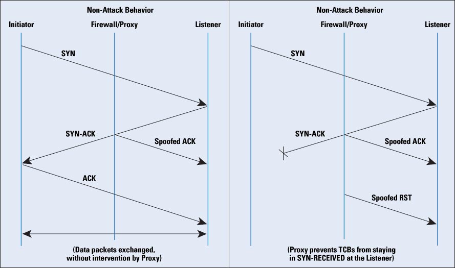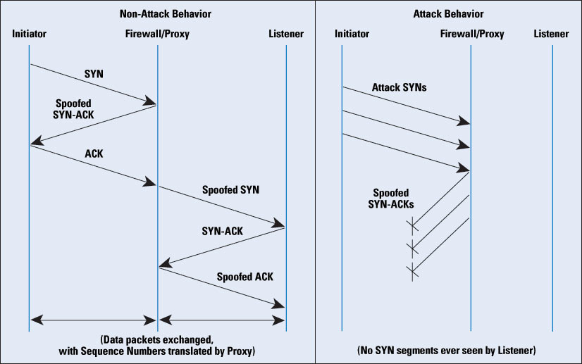 如果连接发起人是合法的,防火墙/代理就会收到ACK,然后在它自己和服务器之间建立连接并伪装连接发起人的地址。防火墙/代理将连接双方分割开。这种分割能够抵御SYN洪泛攻击,因为服务器方根本没接受收过攻击者的SYN。只要防火墙/代理实现了一些基于TCP的防御策略,比如SYN cookies或SYN 缓存,他就能够保护所有在其后面的服务器免于SYN洪泛攻击。