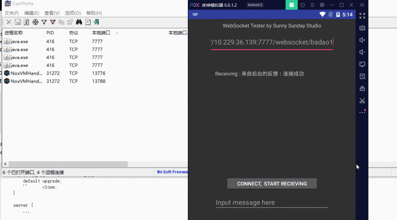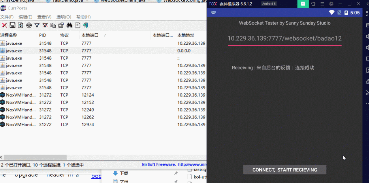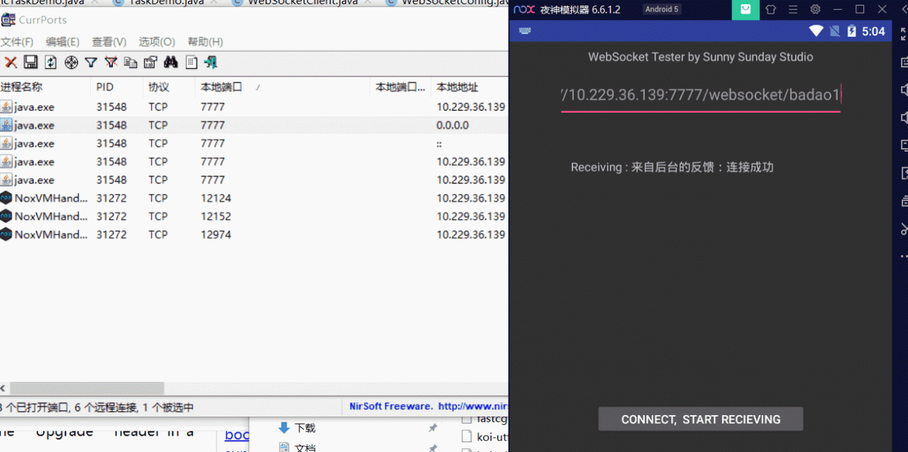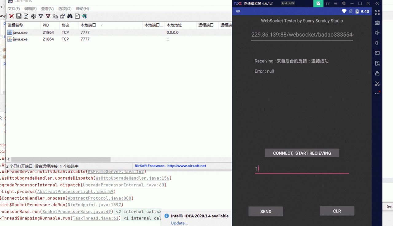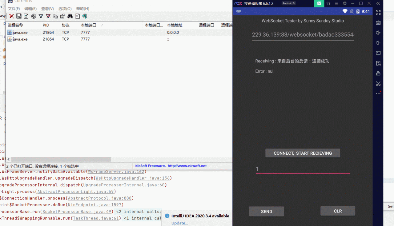 1、用Android模拟器以及websocket测试软件来模拟上面异常关闭连接(断网)连接数不变的情况