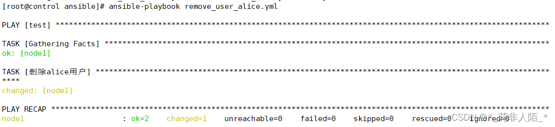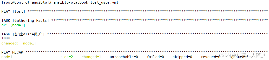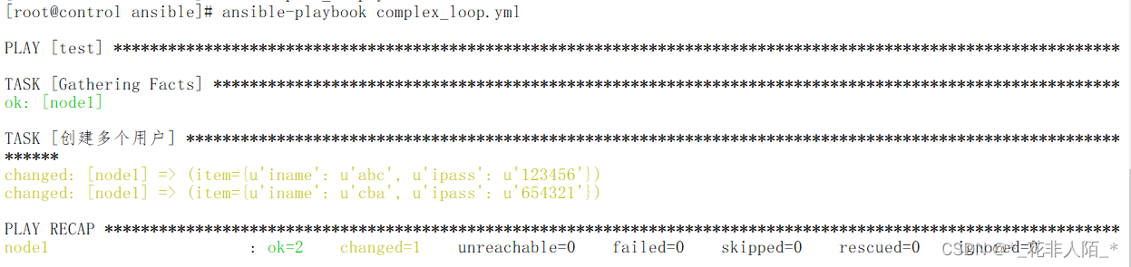 [root@control ansible]# ansible-playbook complex_loop.yml --- - hosts: test tasks: - name: "创建多个用户" user: name: "{{item.iname}}" #item为关键字不可变 password: "{{item.ipass | password_hash('sha512')}}" #多级用.分隔 loop: - { iname: 'abc',ipass: '123456' } #冒号后要用空格 - { iname: 'cba',ipass: '654321' } #loop第一、二个值里面有两个子值,iname和ipass