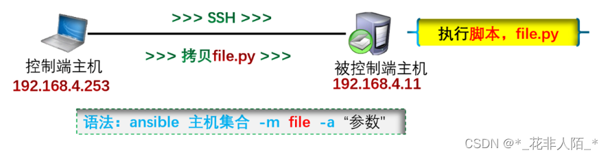 在被管理端主机执行模块(脚本)或命令,执行不同的模块或命令可以实现不同的功能;