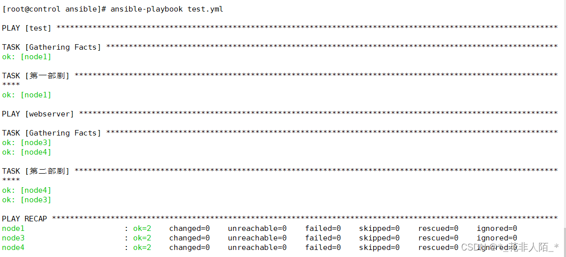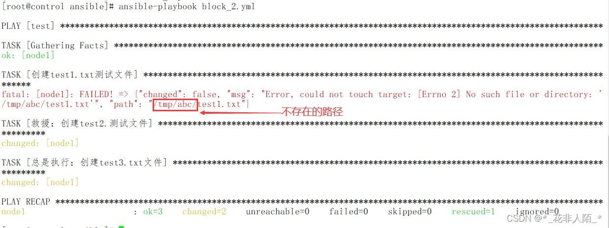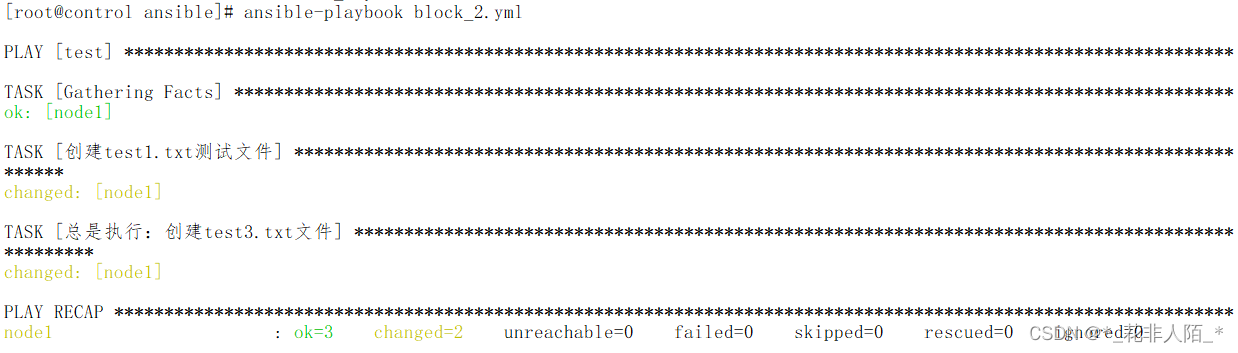 [root@control ansible]# vim block_2.yml --- - hosts: test tasks: - block: - name: "创建test1.txt测试文件" file: name: /tmp/test1.txt #改一个不存在的路径就会执行rescue state: touch rescue: - name: "救援:创建test2.测试文件" #当block失败时启用 file: name: /tmp/test2.txt state: touch always: - name: "总是执行:创建test3.txt文件" file: name: /tmp/test3.txt state: touch