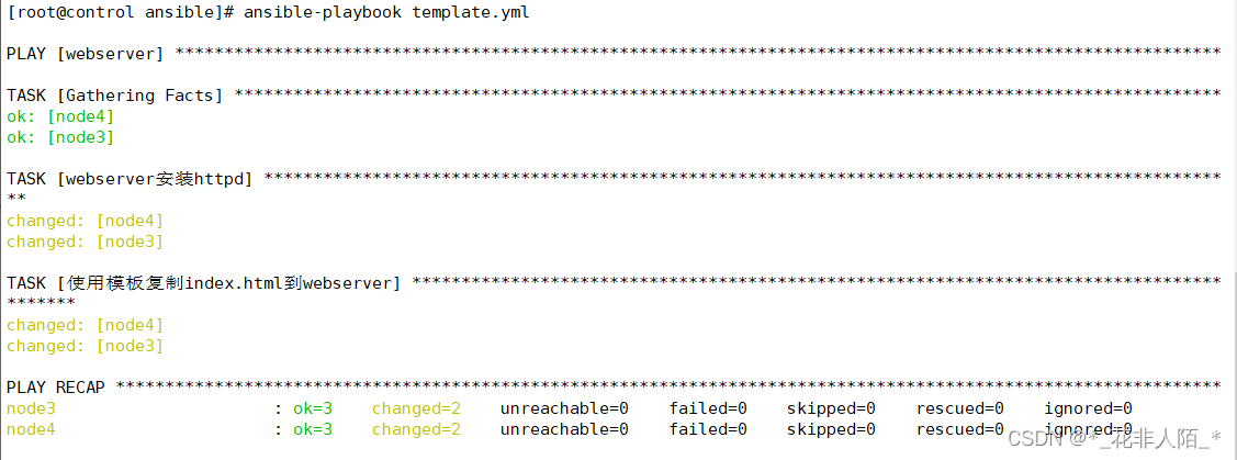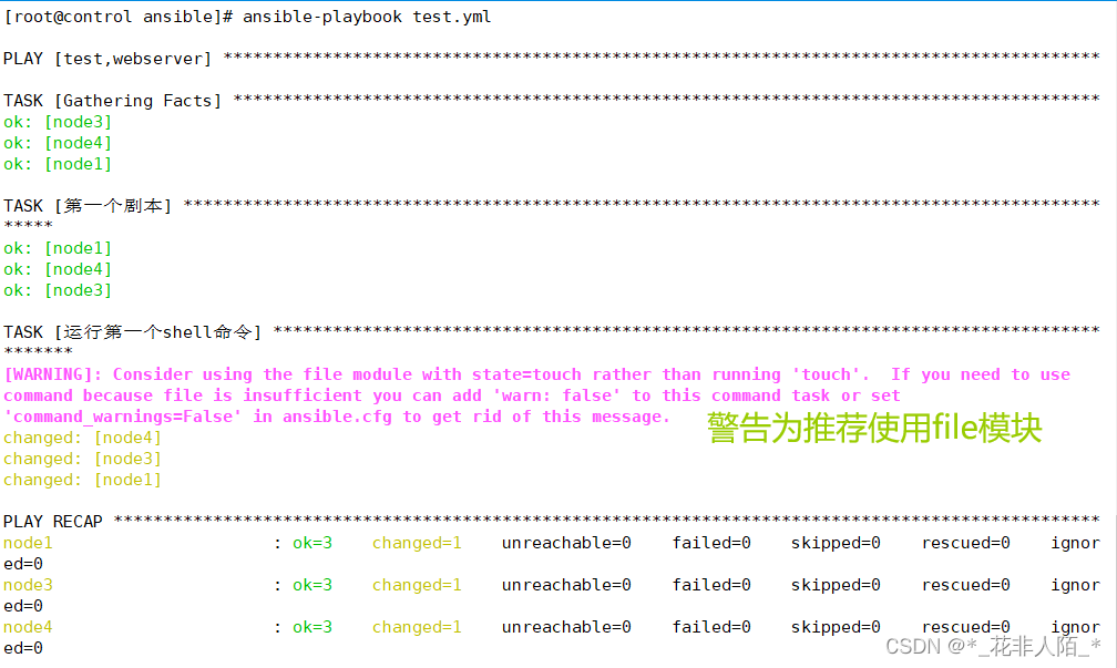 [root@control ansible]# vim test.sh #编写测试脚本 #!/bin/bash yum -y install httpd systemctl start httpd [root@control ansible]# ansible test -m script -a "./test.sh"