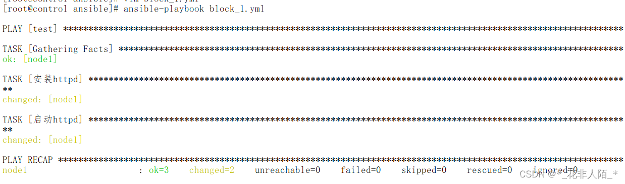 [root@control ansible]# vim block_1.yml --- - hosts: test tasks: - name: "定义一个任务组" block: - name: "安装httpd" yum: name: httpd - name: "启动httpd" service: name: httpd state: started when: ansible_distribution == "CentOS" #仅当条件满足再执行任务组 #注意:when和block是对齐的,他们在一个级别,当条件满足时要执行的是任务组(不是某一个任务)