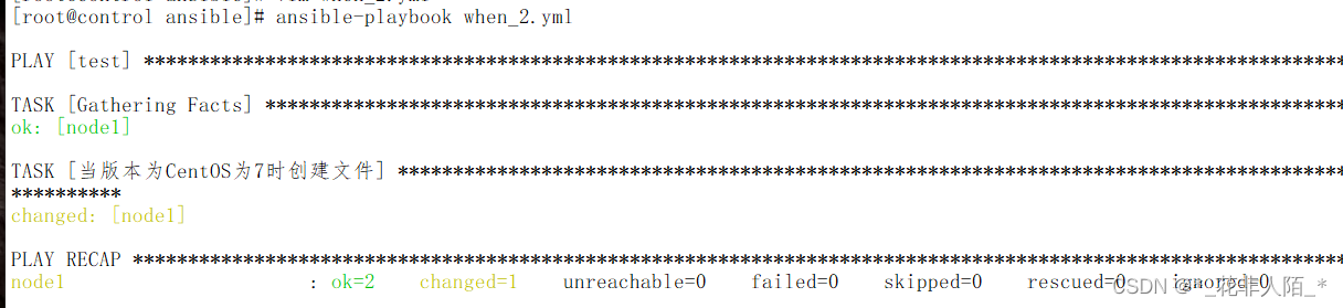 判断操作系统是CentOS7则创建测试文件 [root@control ansible]# vim when_2.yml --- - hosts: test tasks: - name: "当版本为CentOS为7时创建文件" file: path: /tmp/when.txt state: touch when: > #支持多行输入,不保留换行符 ansible_distribution == "CentOS" #使用setup模块查看这些变量 and ansible_distribution_major_version == "7"