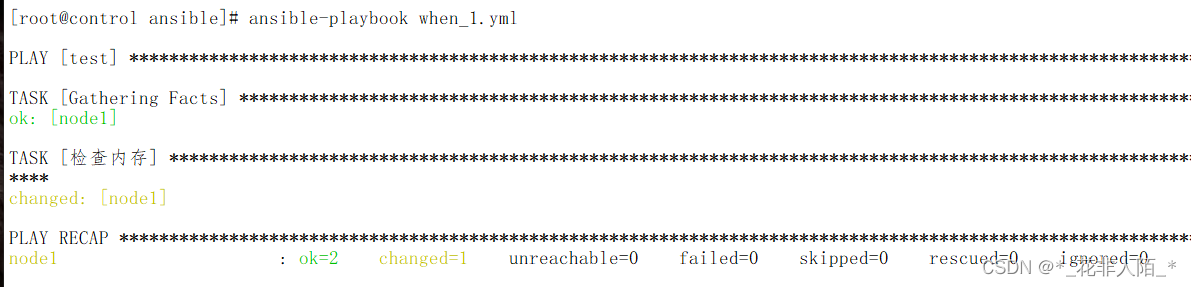 案例:当主机内存不足600M则关闭NetworkManager服务 [root@control ansible]# vim when_1.yml --- - hosts: test tasks: - name: "检查内存" service: name: NetworkManager state: stopped when: ansible_memfree_mb < 600