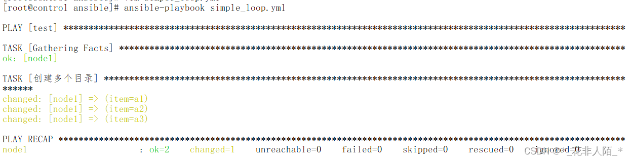 [root@control ansible]# vim simple_loop.yml --- - hosts: test tasks: - name: "创建多个目录" file: path: /tmp/{{item}} #item为关键字 state: directory loop: - a1 - a2 - a3