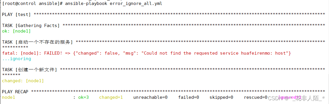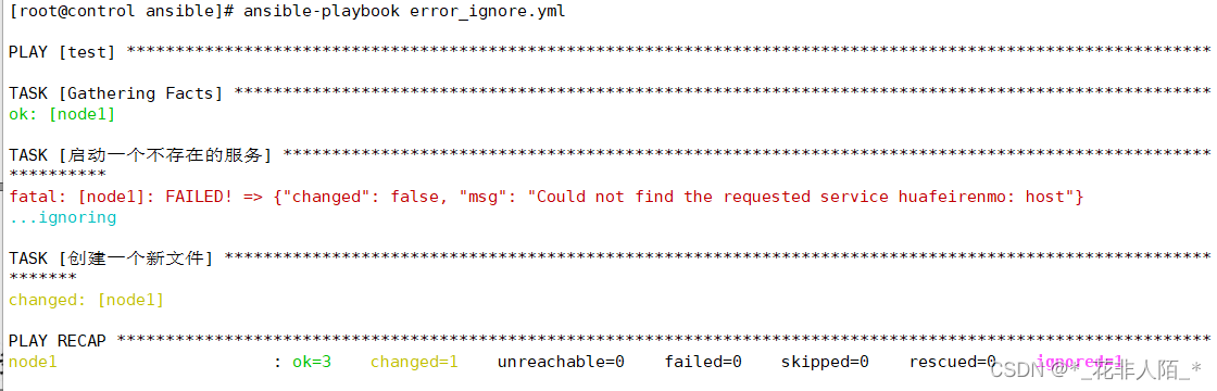 [root@control ansible]# vim error_ignore.yml --- - hosts: test tasks: - name: "启动一个不存在的服务" service: name: huafeirenmo state: started ignore_errors: true #针对某一个任务忽略错误,要与任务对齐; - name: "创建一个新文件" #ignore_errors是关键词 file: path: /tmp/service.txt state: touch