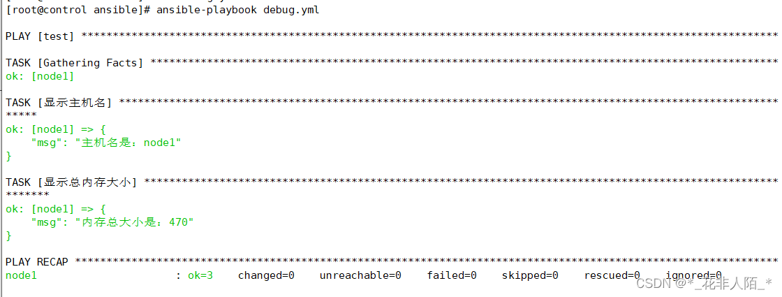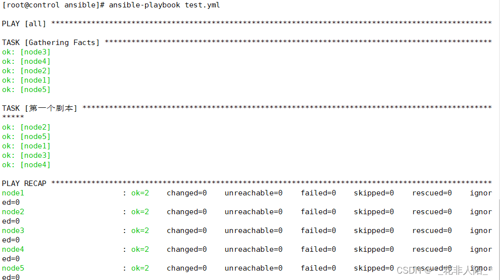 [root@control ansible]# ansible all --list-hosts #查看所有主机列表 hosts (5): node2 node1 node3 node4 node5 [root@control ansible]# ansible node1 -m ping #调用ping模块 node1 | SUCCESS => { "ansible_facts": { "discovered_interpreter_python": "/usr/bin/python" }, "changed": false, "ping": "pong" } #该模块虽然叫ping,但是它不会发送任何ICMP协议的ping数据包,控制端主机仅仅 #是ssh远程被管理端主机,检查其是否有python环境,能顺利远程并且有Python环 #境就会返回正确的提示信息,否则报错。