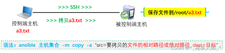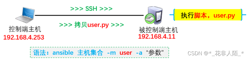 - Michael DeHaan也是Cobbler的作者 - 于2015年被RedHat收购 Ansible是一款自动化运维工具,基于Python开发 - 批量系统配置 - 批量程序部署 - 批量运行命令等功能 批量修改服务器密码 批量安装软件包 批量修改配置 ansible通过ssh远程被管理主机,将控制端的模块(脚本)或命令传输到被管理主机;