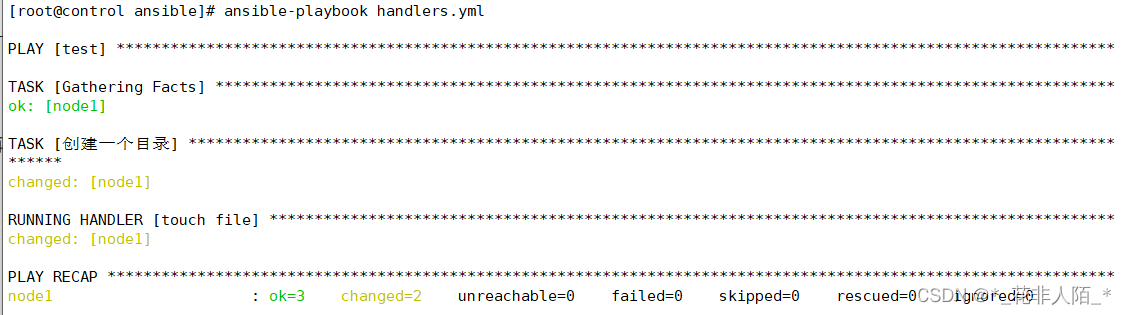 [root@control ansible]# vim handlers.yml --- - hosts: test tasks: - name: "创建一个目录" #多次执行playbook该任务状态不再是changed file: path: /tmp/parents/subdir/ state: directory notify: touch file #notify后面名称必须和handlers中的任务名称一致 handlers: - name: touch file file: path: /tmp/parents/subdir/new.txt state: touch