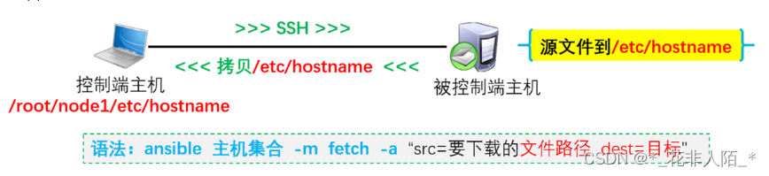 [root@control ansible]# ansible test -m fetch -a "src=/etc/hostname dest=~/" #将远程主机的hostname文件下载到本地家目录