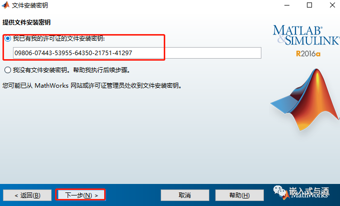 4、选择“我已有我的许可证的文件安装密钥,将下载好的补丁文件合密钥解压,打开密钥.txt后,复制里面的密钥放在以下框框中,再点击下一步。