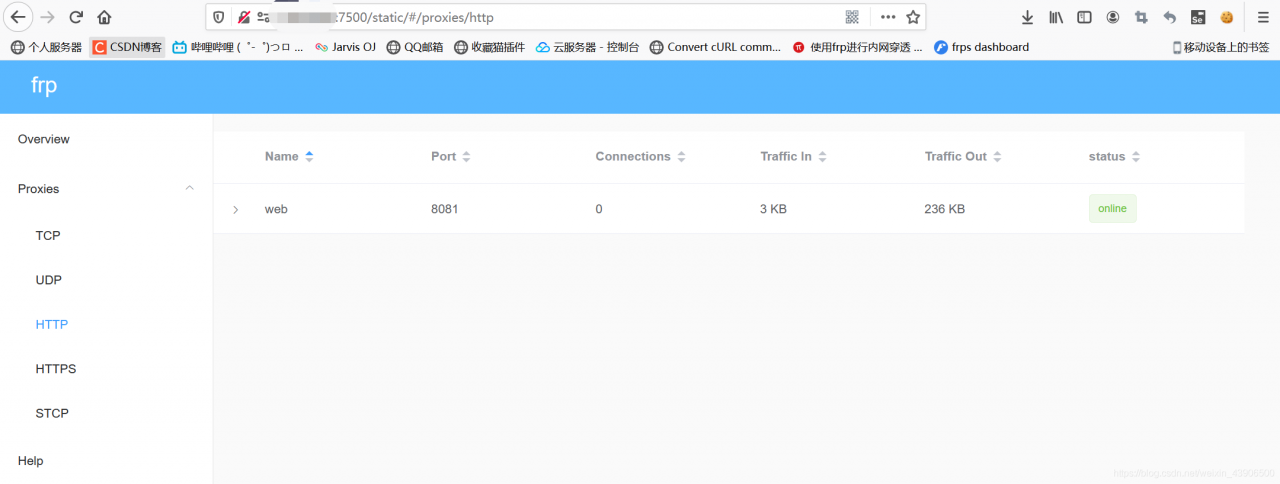 - “dashboard_port”是服务端仪表板的端口,若使用7500端口,在配置完成服务启动后可以通过浏览器访问 x.x.x.x:7500 (其中x.x.x.x为VPS的IP)查看frp服务运行信息。