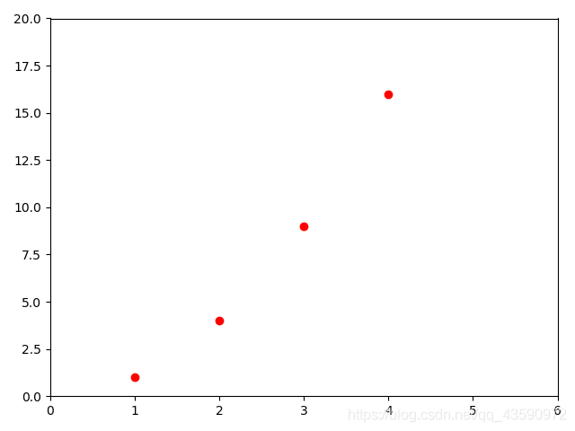 plt.axis([0, 6, 0, 20]) # [xmin, xmax, ymin, ymax]