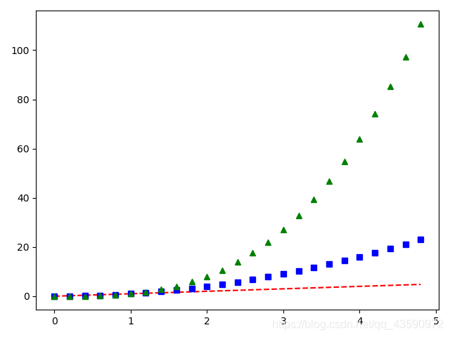 plt.plot(t,t,'r--', t,t**2,'bs', t,t**3,'g^')