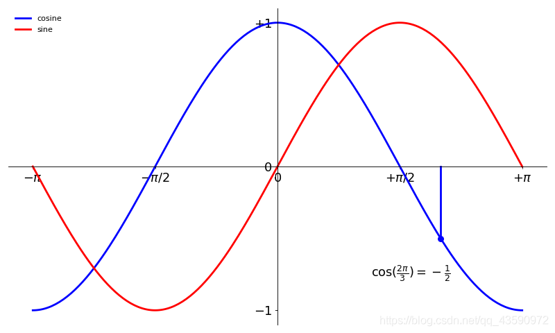 plt.annotate(r'$\cos(\frac{2\pi}{3})=-\frac{1}{2}$',