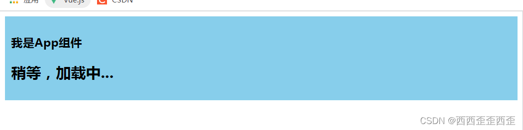 Suspense包裹组件,并配置好default与fallback<template> <div class="app"> <h3>我是App组件</h3> <Suspense> <template v-slot:default> <Child/> </template> <template v-slot:fallback> <h3>加载中.....</h3> </template> </Suspense> </div> </template>