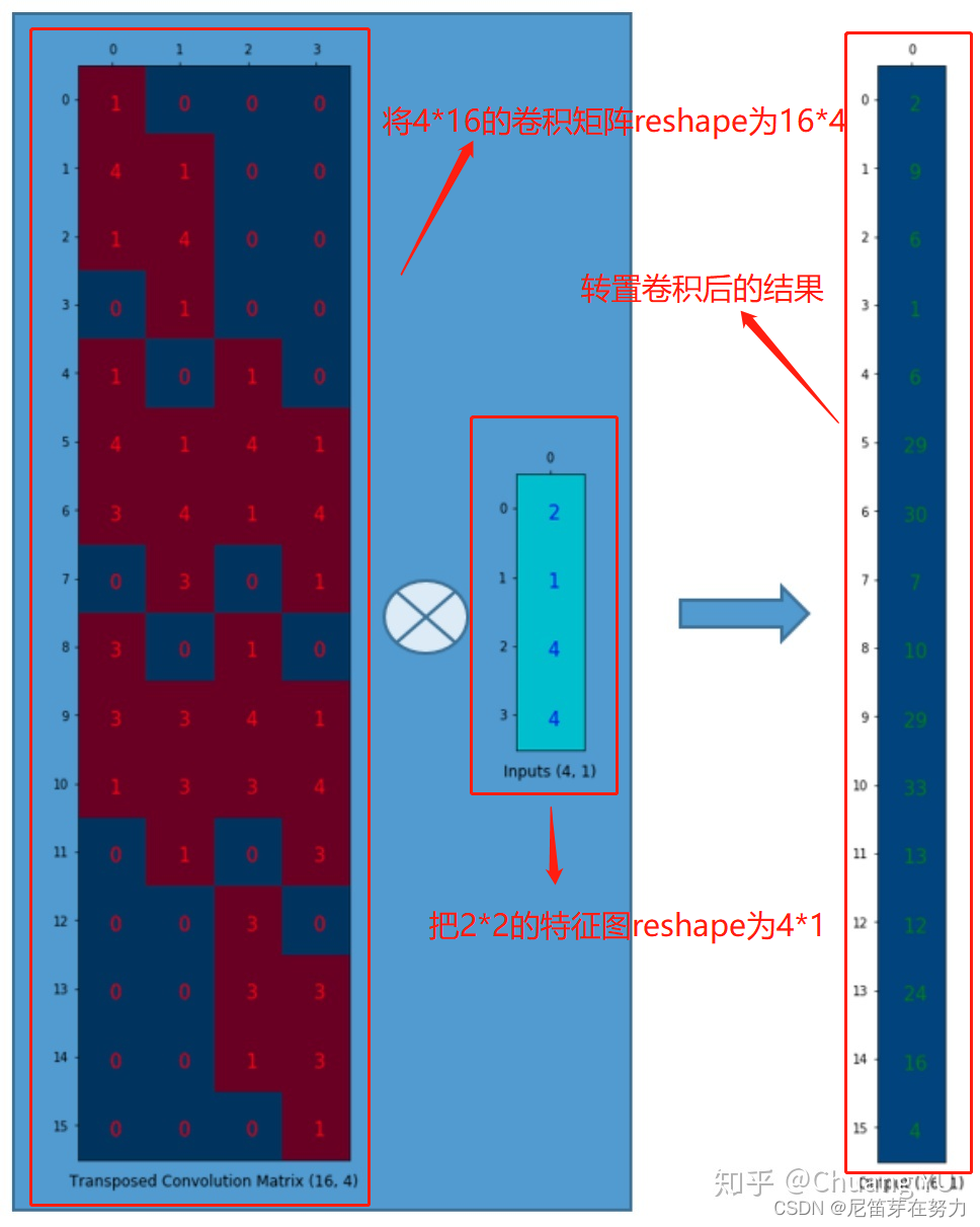 (3)deconvolution:将卷积矩阵转置之后,然后在这个基础上再做卷积。从矩阵角度理解转置卷积,我加了一些描述:(图源来自网络)