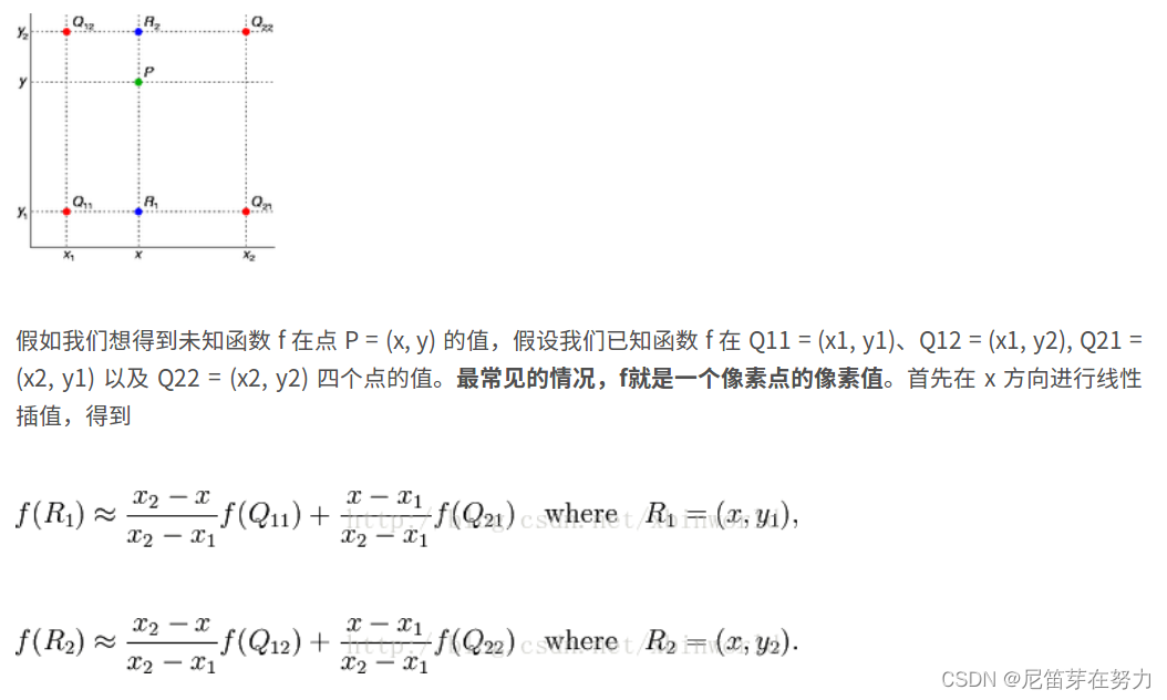 (2)interpolation:比如最邻近元法、双线性插值,双三次插值算法等,如图是一个双线性插值的例子(图源来自网络):