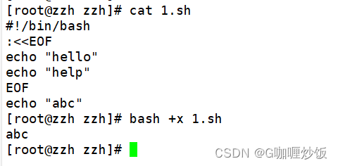 - “ : ”代表什么都不做的空命令。中间标记区域的内容不会被执行,会被bash 忽略掉,因此可达到批量注释的效果。