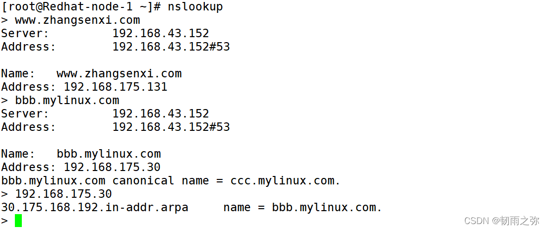 local-data-ptr: "192.168.175.131 www.zhangsenxi.com."4、客户端:修改/etc/resolv.conf将 nameserver 192.168.43.152添加到该文件的内容中。 并使用命令:nmcli networking off 。接着nmcli networking on