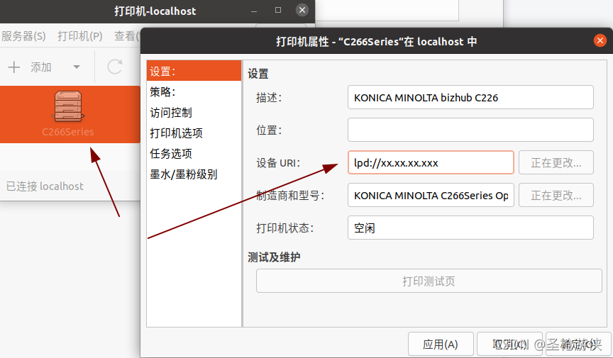 3.右键打印机点击属性,修改相应URI