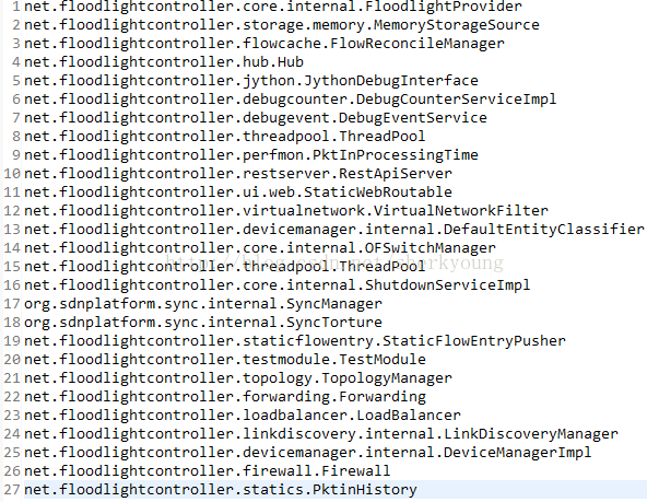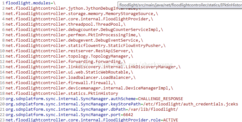 7.除上述配置外,还需要在resources/floodlightdefault.properties中的floodlight.modules配置参数后追加新增模块名(net.FloodLight.controller.statics.PktinHistory 注:这里就要根据添加的PktinHistory 类的具体路径进行修改),表明该配置启动时必须加载。