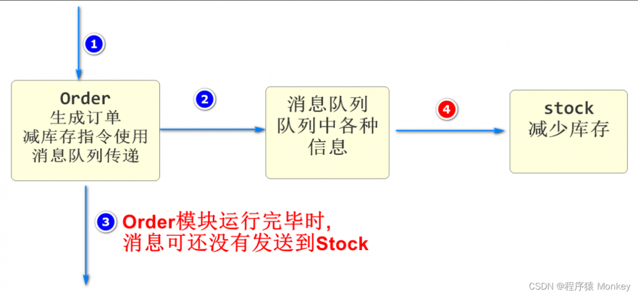 当消息队列中(stock)发生异常时,在异常处理的代码中,我们可以向消息的发送者(order)发送消息,然后通知发送者(order)处理,消息的发送者(order)接收到消息后,一般要手写代码回滚,如果回滚代码过程中再发生异常,就又要思考回滚方式,如果一直用消息队列传递消息的话,可能发生异常的情况是无止境的